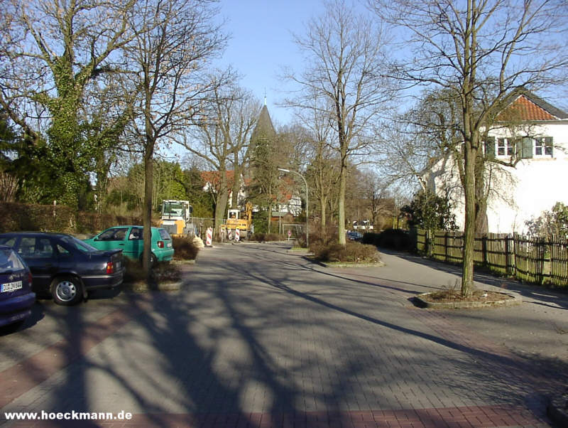 Links befindet sich der Brechtener Friedhof. Im Hintergrund der Turm der evangelischen Kirche St. Johann Baptist.