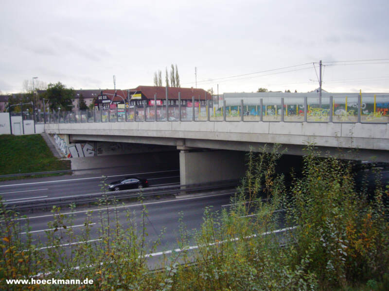 Die neue Brücke über die A2 ist natürlich schon wieder beschmiert. Im Hintergrund sieht man den REWE-Supermarkt.