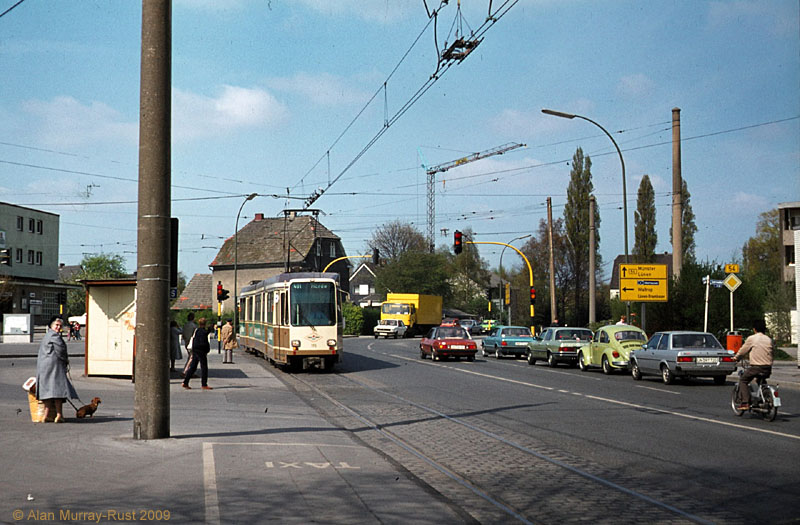Straßenbahn an der Haltestelle, rechts die ehemalige Ampelanlage - Frühjahr 1982
