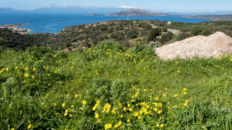 Im Hintergrund das Taygetos-Gebirge und links der Ort Archangelos
