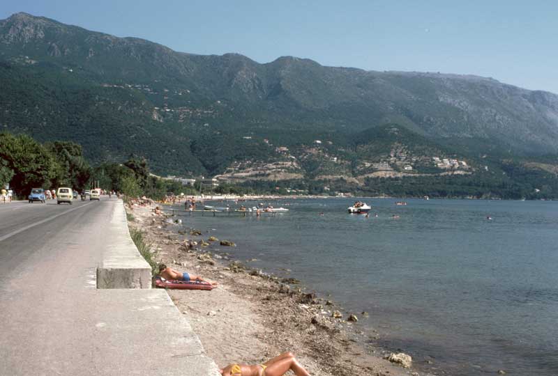 Hauptstraße und Strand am Südende der Bucht von Ipsos -