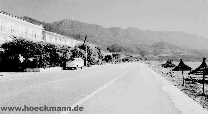 Im März 1977 war der Verkehr noch sehr gering, vor allem im außerhalb der Saison. Rechts liegt der schmale Sandstrand.