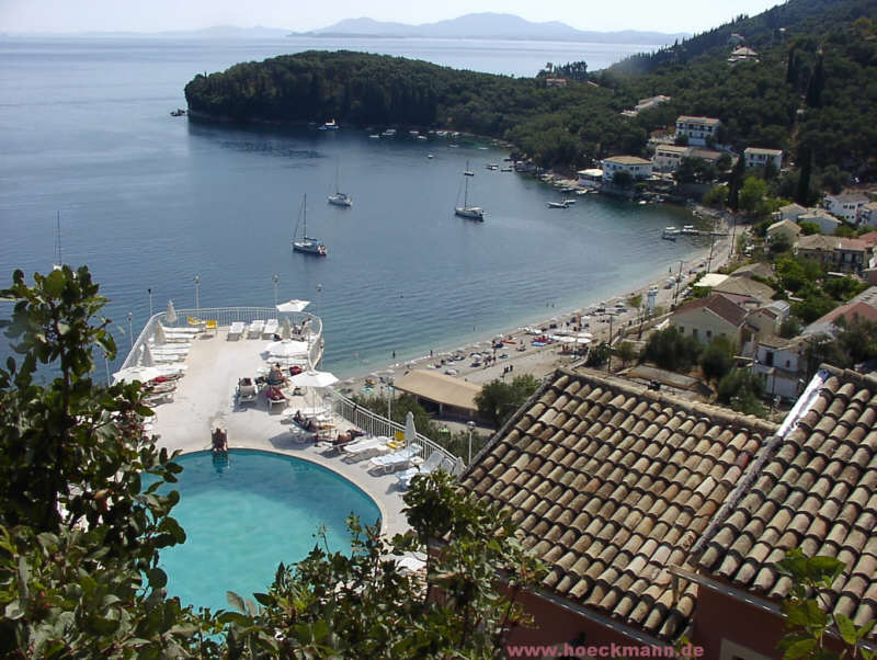 Das "weiße Haus" in dem die Familie Durell wohnte, liegt rechts am Ende des Strandes direkt am Wasser