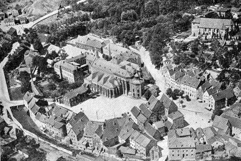 Luftaufnahme. Im Mittelpunkt ehem. Abtei Abteikirche mit