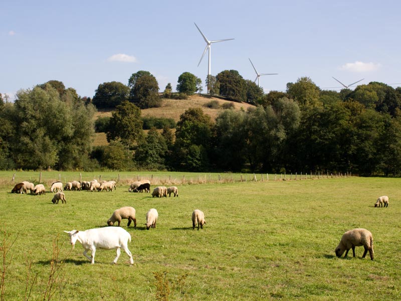 umstanden von Büschen und Bäumen und dazu noch einige Windräder