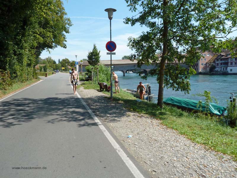 Badende in Gailingen, das mit dem schweizerischen Diessenhofen durch eine überdachte Holzbrücke verbunden ist.