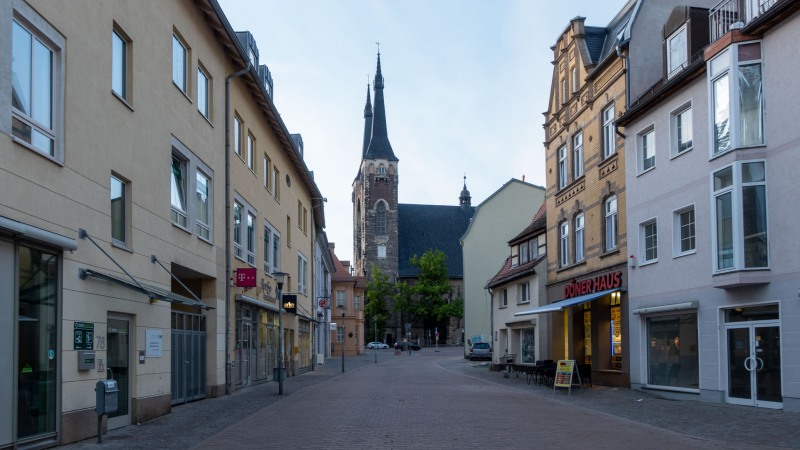Blick durch die Hallesche Straße auf St. Jakob in Köthen