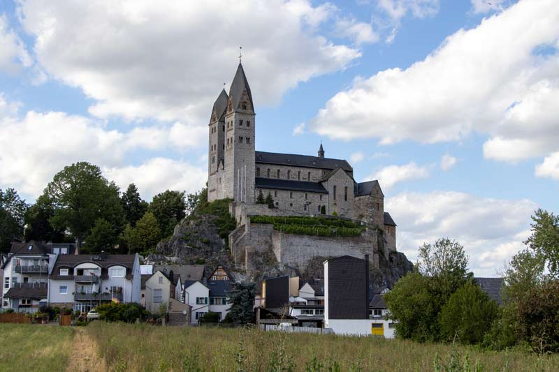 Dietkirchen hat eine imposante Kirche oben auf einem Felsen. Historisch befinden wir uns im Kurfürstentum Trier. Radtour entlang der Lahn - Juli 2020