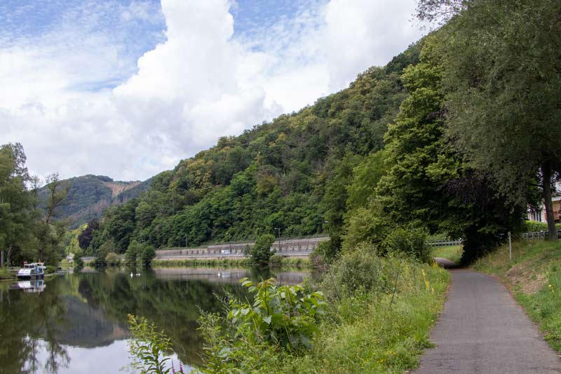 Am letzten Morgen ist das Lahntal immer noch recht eng und Radweg, Straße und Bahnlinie liegen direkt nebeneinander. Radtour entlang der Lahn - Juli 2020