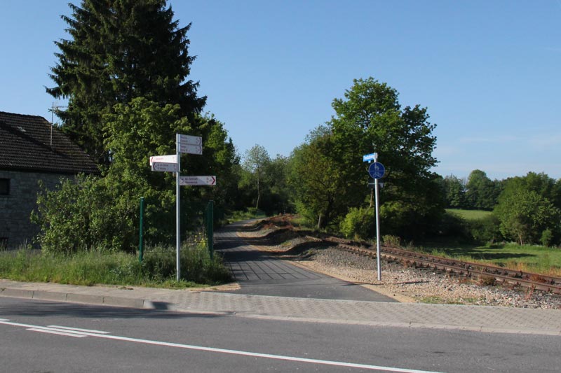 Die Beschilderung entlang dem Vennbahnradweg ist sehr gut. Positiv ist, dass nicht nur die jeweils nächsten Orte ausgeschildert sind, die man als Ortsunkundiger häufig gar nicht kennt, sondern es werden auch immer die nächsten größeren Orte genannt, wie Monschau oder St. Vith. - Mai 2014
