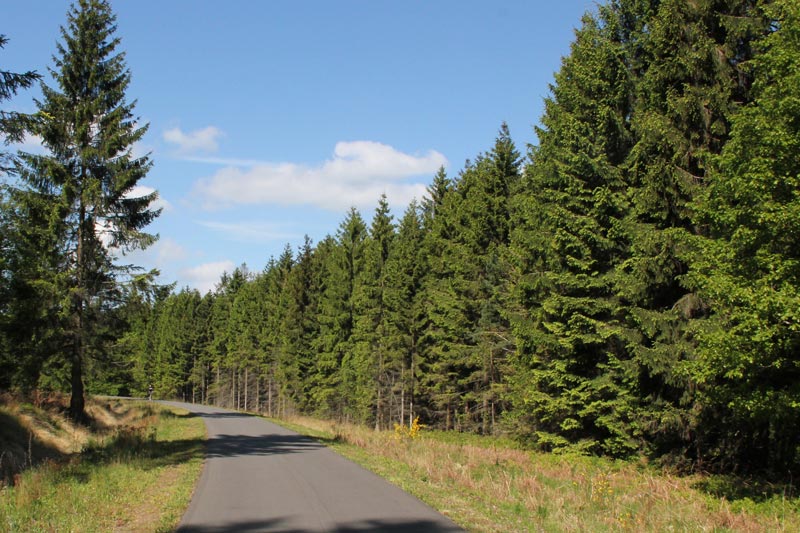 Da es stetig bergan geht, kommt man auch in die Regionen intensiven Fichtenanbaus. - Mai 2014