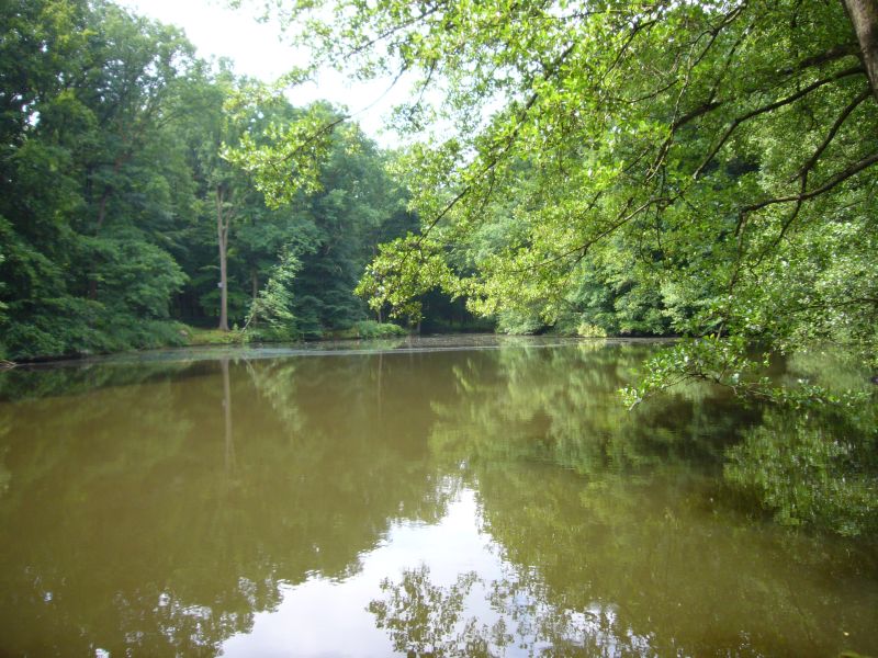Westlich des Hauses Dellwig erstreckt sich das Naturschutzgebiet Dellwiger Bach mit einem Teich im Wald.